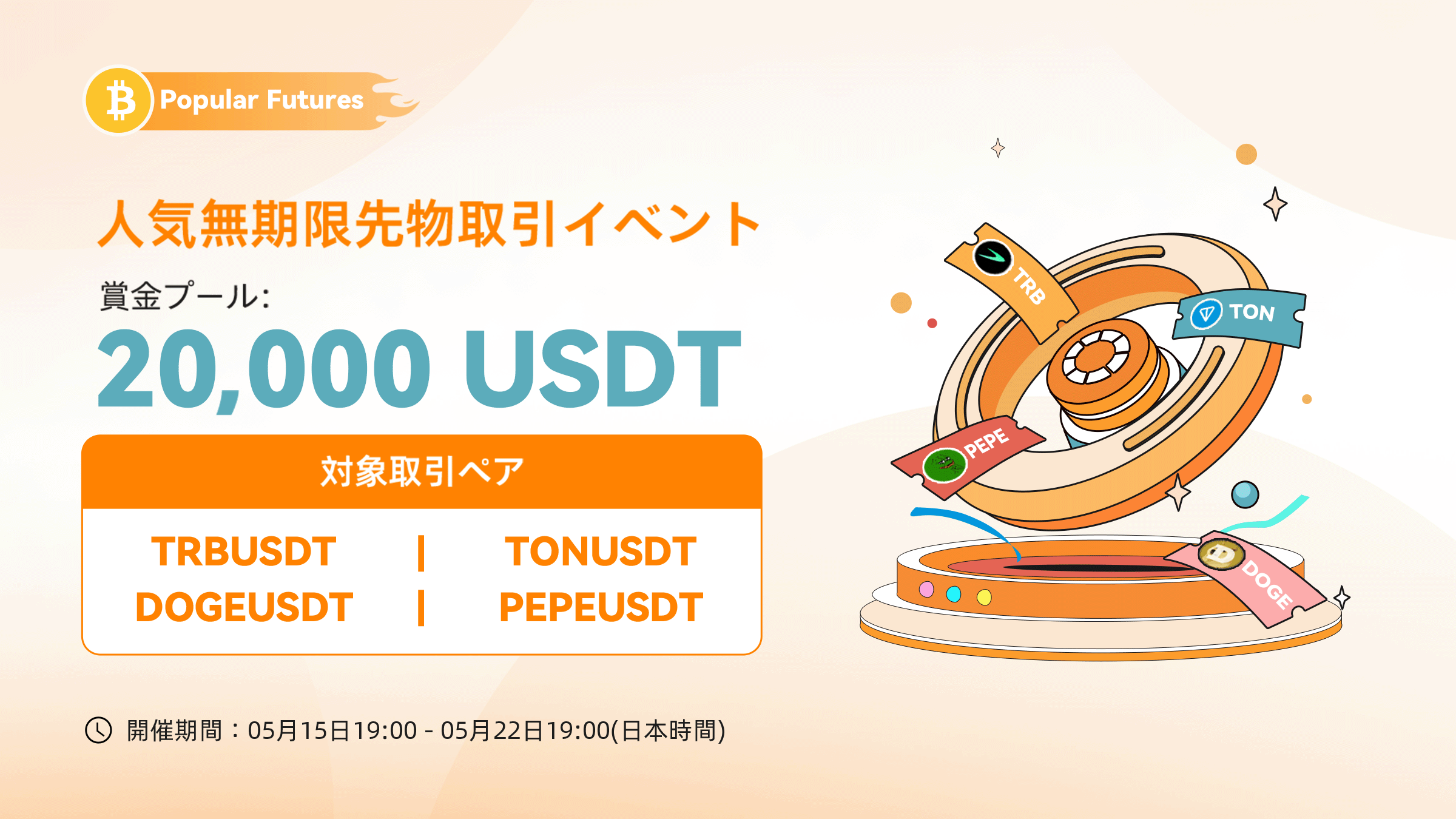 イベント期間中に、無期限先物契約取引で初回取引を完了し、前述したイベントの先物取引ペアの累計取引高が20,000 USDT以上のユーザー様に、10 USDTの先物ボーナスをプレゼントいたします。イベント1は先着1,000名様限定の報酬となります。