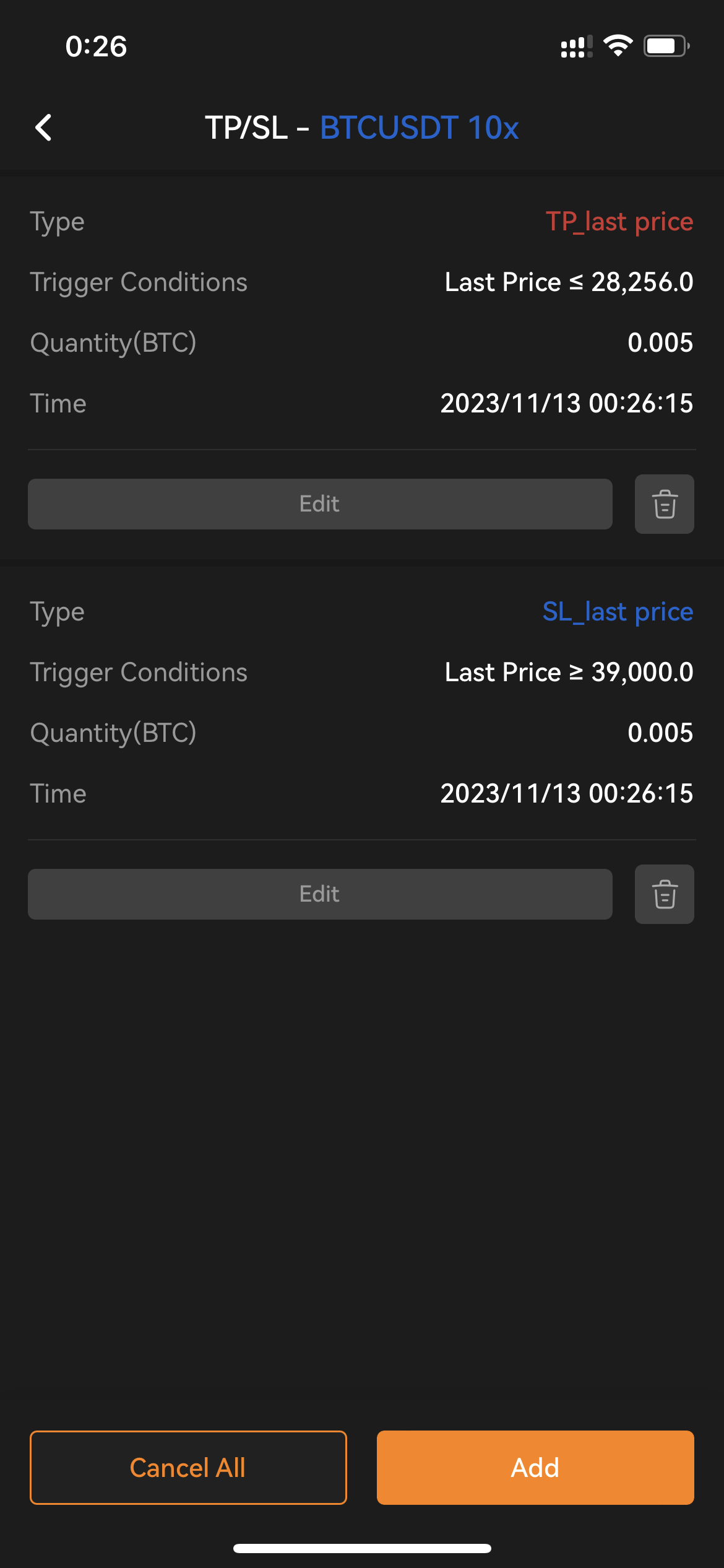 If you want to cancel Your TP/SL order, you can click [Cancel All] to cancel all your TP/SL order in one click. Or you can click on Delete icon of each record to cancel the specified TP/SL order.